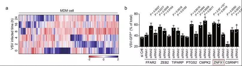作者首先分析了他們先前發(fā)表的被水皰性口炎病毒(VSV)感染的單核細胞衍生巨噬細胞(MDM)的IVT-SAPAS(in vitro transcription-sequencing alternative polyadenylation sites)數據,并發(fā)現了許多表達改變的基因?!局耙寻l(fā)表文章的數據重新挖掘】通過(guò)比較受VSV感染的人MDM數據和小鼠腹膜巨噬細胞數據,發(fā)現了一些共同的基因,它們被上調了三倍以上,包括FFAR2,ZEB2,TIPAP,PTGS2,CMPK2,ZNFX1和CSRNP1。隨后敲除A549細胞中的這些基因,用VSV-eGFP(VSV-增強型綠色熒光蛋白)感染細胞,流式細胞術(shù)檢測GFP陽(yáng)性細胞的百分比表明,敲減ZNFX1(其抗病毒作用尚未見(jiàn)報道)促進(jìn)了VSV感染。