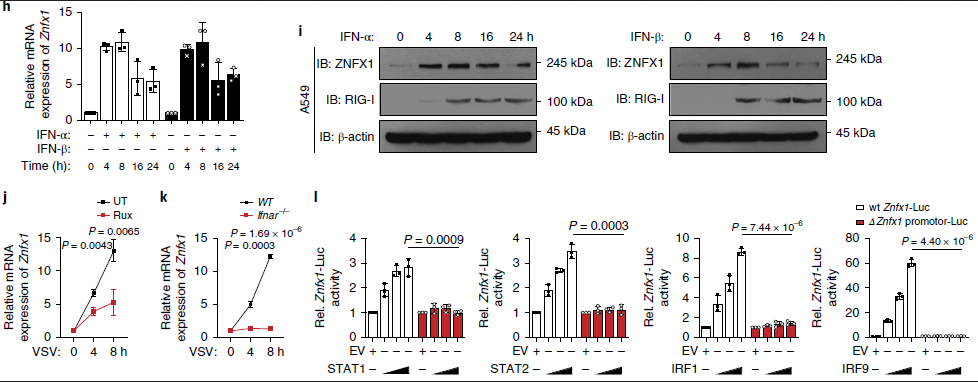 由于病毒感染導致ZNFX1的mRNA和蛋白質(zhì)水平表達均增強,接下來(lái)通過(guò)將A549細胞與人重組IFN-α和IFN-β一起孵育來(lái)檢測ZNFX1是否為ISG。qRT-PCR和免疫印跡分析的結果表明ZNFX1的表達可以被IFN-α和IFN-β誘導(圖1h,i)。相比之下,JAK1抑制劑魯索替尼(ruxolitinib)可以抑制VSV對Znfx1 mRNA的誘導,并且在Ifnar1-/-A549細胞中幾乎消失(圖1j,k)。