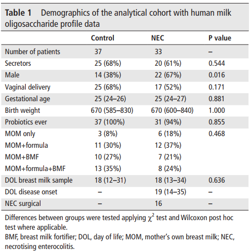 目的:壞死性小腸結腸炎(NEC)是一種影響早產(chǎn)兒的嚴重腸道疾病。人們對其潛在機制知之甚少:母親自己的母乳(MOM)具有保護性,可能與母乳寡糖(HMO)和嬰兒腸道微生物相互作用。作者研究了HMO和嬰兒腸道微生物組發(fā)育之間的相互作用及其與NEC之間的關(guān)系。設計:作者對33例NEC患兒和37例對照母乳中的母乳寡糖進(jìn)行了分析。對48名嬰兒(含14例NEC患兒)糞便進(jìn)行了縱向宏基因組測序(n=644)。