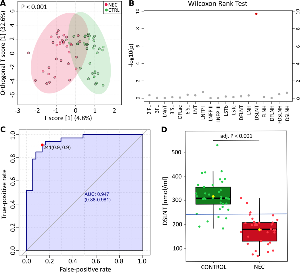 考慮到較低的DSLNT與NEC相關(guān)而不受分泌狀態(tài)的影響,作者探討了HMO作為NEC發(fā)育的生物標志物的用途。單因素ROC曲線(xiàn)分析表明,241nmol/ml是MOM中DSLNT鑒別NEC和對照嬰兒的最佳濃度(圖1C和D)。AUC值為0.947,靈敏度為0.9,特異性為0.9。