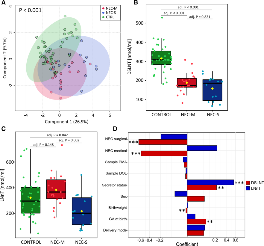 作者隨后通過(guò)調整線(xiàn)性模型研究了DSLNT和LNnT濃度與臨床變量之間的潛在關(guān)聯(lián)。DSLNT與兩種疾病類(lèi)型呈負相關(guān),NEC-M的系數值為-0.60,NEC-S的系數值為-0.67(圖2D)。然而根據調整后的線(xiàn)性模型LNnT與疾病類(lèi)型無(wú)關(guān)。分泌型母親中DSLNT和LNnT均顯著(zhù)較高。母親的DSLNT與胎齡呈正相關(guān),與出生體重呈負相關(guān)。HMO與母親性別、分娩方式、胎齡和DOL均無(wú)相關(guān)性(圖2D)。