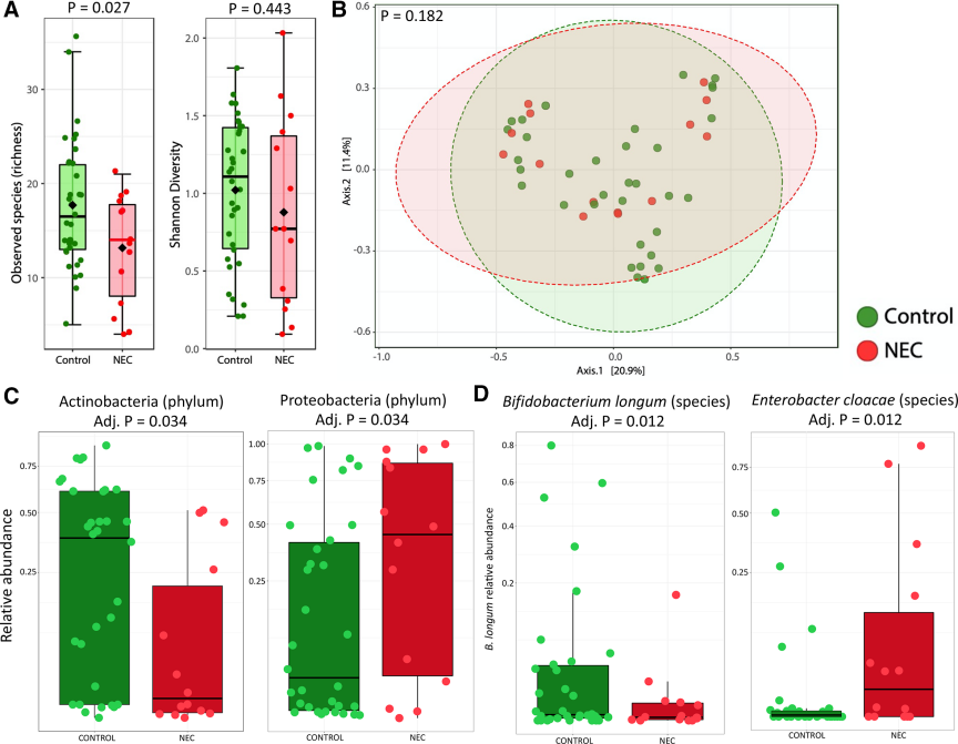 作者納入了含有HMO數據的嬰兒的糞便微生物組數據,進(jìn)行獨立研究獲得宏基因組測序數據。14例NEC患兒和34例對照組的644個(gè)糞便樣本。NEC患兒物種豐富度顯著(zhù)降低,shannon指數差異不顯著(zhù)(圖3A)。PCoA分析顯示NEC和對照之間細菌菌群結構差異不大(圖3B)。門(mén)水平分析顯示,相比于對照組NEC患兒Actinobacteria 相對豐度顯著(zhù)降低,Proteobacteria 相對豐度顯著(zhù)升高(圖3C)。種水平分析相比于對照組NEC患兒B. longum相對豐度降低,Enterobacter cloacae相對豐度升高(圖3D)。