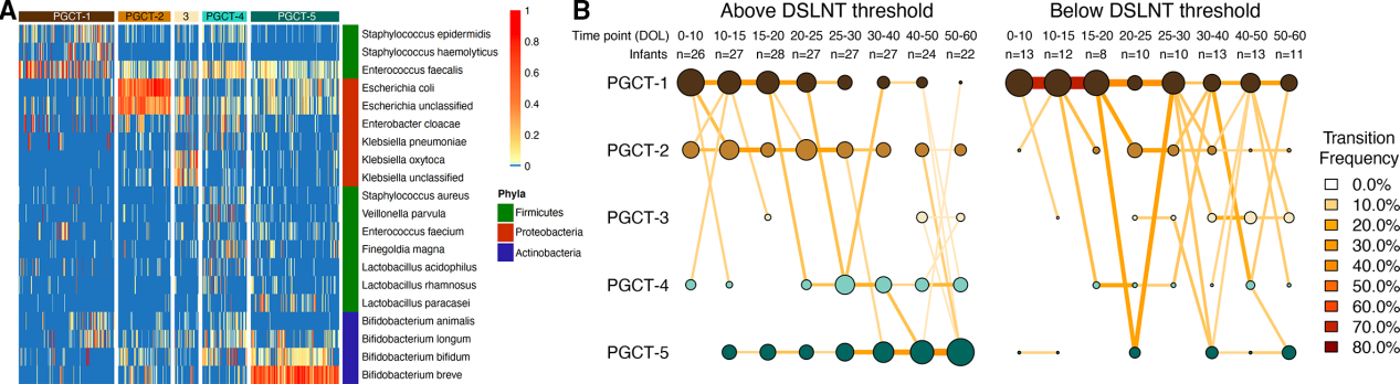 采用種水平數據對PGCTs進(jìn)行DMM聚類(lèi),5種PCGTs最理想(圖4A)。PGCT-1特征菌是高豐度Staphylococcus?spp和Enterococcus faecalis,PGCT-2高豐度Escherichia?spp,PGCT-3高豐度Klebsiella?spp,PGCT-4和PGCT-5高豐度Bifidobacterium?spp,B. breve在PGCT-5豐度高。根據樣本在所有時(shí)間點(diǎn)和clusters上的分布,在出生后前70天內接受MOM中DSLNT高于和低于241nmol/ml的嬰兒微生物組差異顯著(zhù)(圖4B)。在校正組間抽樣頻率不均勻后,最后一個(gè)時(shí)間點(diǎn)接受MOM超過(guò)DSLNT閾值2倍的嬰兒類(lèi)似于PGCT-5,其Bifidobacterium高豐度(圖4A)。