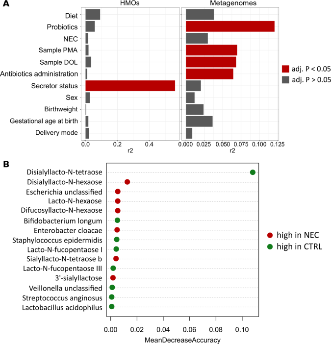 作者比較了基于HMO數據集、宏基因組數據和兩個(gè)數據集結合建立的區分嬰兒NEC和健康的隨機森林模型的性能,鑒于所有這些信息在疾病發(fā)病前就可以獲得,因此在臨床實(shí)踐中可作為風(fēng)險分類(lèi)系統。在組合模型中,DSLNT在對照組富集,DSLNH和Escherichiaunclassified的相對豐度在NEC中高(圖5B)。