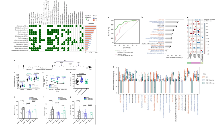 本文中研究者分析了90名無(wú)藥物治療精神分裂癥患者和81名健康對照者的糞便微生物組,確定了一種能夠區分患者和對照者的微生物物種分類(lèi)器。研究者發(fā)現與精神分裂癥相關(guān)的功能性潛能包括短鏈脂肪酸合成、色氨酸代謝以及神經(jīng)遞質(zhì)的合成/降解等方面的差異。Streptococcus vestibularis(精神分裂癥中比較富集的細菌)的移植會(huì )引起小鼠的社交行為缺陷,并改變小鼠外周組織中神經(jīng)遞質(zhì)的水平。本文為隊列研究和動(dòng)物模型的進(jìn)一步研究提供了新的線(xiàn)索。
