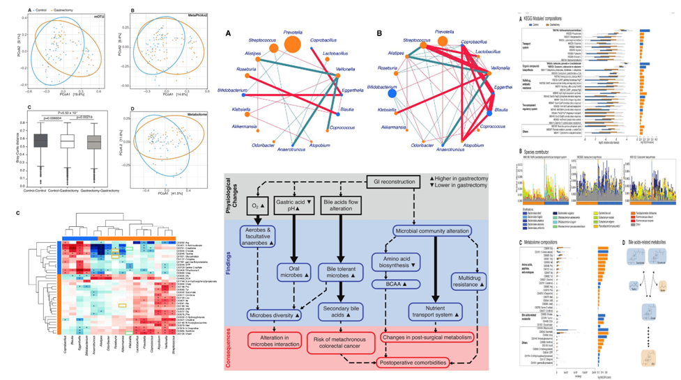 最近的證據表明,腸道微生物組參與了術(shù)后結果,包括胃切除術(shù)后。該研究對有胃癌切除史患者(n=50)和健康個(gè)體(n=56)的糞便樣本的宏基因組測序和代謝組學(xué)分析結果進(jìn)行對比分析。結果表明,胃切除術(shù)后不僅改變了患者糞便中微生物(如需氧菌和兼性厭氧菌等)群落構變化,也改變了微生物功能特征,如營(yíng)養物質(zhì)運輸和有機化合物生物合成;胃切除術(shù)后患者體內代謝物發(fā)生變化,如兩組間的基因毒性脫氧膽酸和支鏈氨基酸等膽汁酸含量存在差異,此外部分結直腸癌相關(guān)菌在胃切除術(shù)后患者中表現出相似模式,如具核梭桿菌在全胃切除術(shù)后患者中明顯富集。結果揭示了胃切除術(shù)后腸道微生物群的改變,提示其與術(shù)后并發(fā)癥相關(guān)。