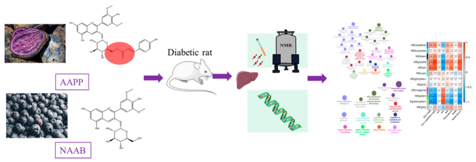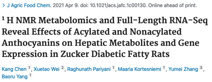 花色苷是植物中的一大類(lèi)多酚化合物,目前已知是對氧化應激、炎癥和能量穩態(tài)有調節作用。已有報道發(fā)現花色苷具有抗糖尿病的療效?;ㄉ盏暮诵慕Y構是花青苷,它可以糖基化形成非?;幕ㄇ嘬?,糖苷可以?;笮纬甚;幕ㄇ嘬?。且最近有研究表明,與未?;幕ㄇ嘬障啾?,?;ㄇ嘬站哂懈玫姆€定性和抗氧化活性。本研究利用全長(cháng)轉錄組學(xué)和核磁共振代謝組學(xué)方法,比較了非?;王;ㄉ諏μ悄虿〈笫蟾闻K基因表達和代謝的影響。這是第一次綜合應用這兩種強大的技術(shù)來(lái)研究肝臟基因表達和代謝產(chǎn)物的變化。