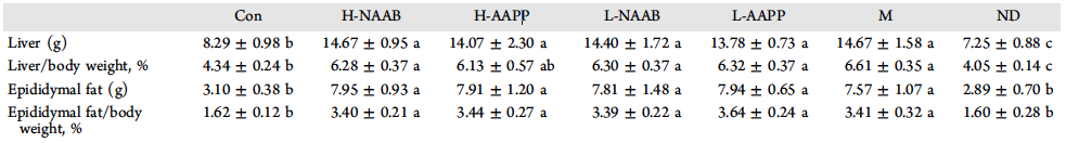 表1中可見(jiàn),M組的肝臟和附睪脂肪重量及其占體重的百分比顯著(zhù)高于CON組和ND組(p<0.05)。CON組的大鼠肝臟重量和肝/體比明顯高于ND組(P<0.05)。H-AAPP組大鼠肝/體重比明顯低于M組(p<0.05)。