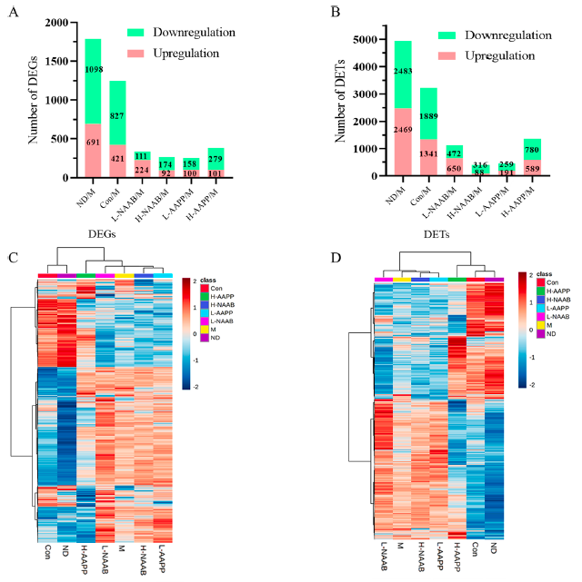 對全長(cháng)轉錄組數據進(jìn)行分析發(fā)現,在6個(gè)不同組之間的差異分析結果中,健康對照組和糖尿病模型之間有691個(gè)上調和1098個(gè)下調的DEGs,2469個(gè)上調和2483個(gè)下調的DETs (圖1A和B)。與M組相比,H-AAPP處理改變了最多的基因和轉錄本(101個(gè)上調和179個(gè)下調的DEGs,89個(gè)上調和780個(gè)下調的DETs)。DEGs和DETs的熱圖顯示,ND組和CON組在基因表達模式上與M組有很大不同,而且H-AAPP組的轉錄組圖譜似乎比M組更接近ND組和CON組(圖1C和D)。