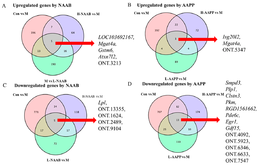 對于花色苷處理組,L-NAAB組上調的DEGs在N-糖鏈生物合成通路中顯著(zhù)富集。L-NAAB組下調的DEGs在泛酸和CoA生物合成通路中顯著(zhù)富集。在H-NAAB、L-AAPP和H-AAPP組中沒(méi)有發(fā)現下調的DEGs有顯著(zhù)富集的通路,在H-NAAB和L-AAPP組中上調的DEGs也沒(méi)有富集的通路。H-AAPP中上調的DEGs在補體和凝血級聯(lián)、不飽和脂肪酸和變形蟲(chóng)病的生物合成等通路中顯著(zhù)富集。