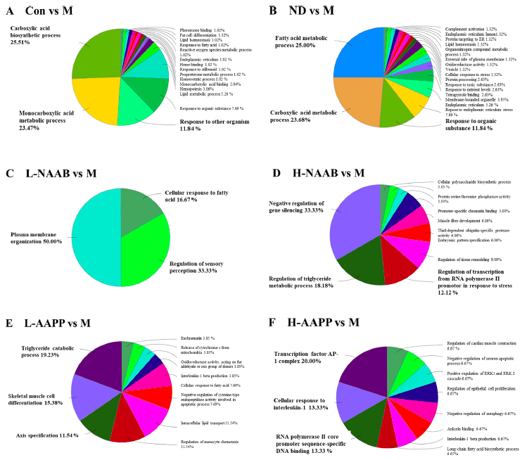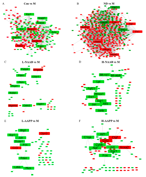 對不同分組中的DEGs進(jìn)行ClueGO分析,以生成按功能分組的注釋網(wǎng)絡(luò )圖(圖4A?F)。在CON/M差異分組的結果中,DEGs主要富集在羧酸生物合成過(guò)程、單羧酸代謝過(guò)程和對其他有機物的反應過(guò)程。在ND/M分組差異結果中,脂肪酸代謝過(guò)程、羧酸代謝過(guò)程和對有機物的反應過(guò)程是富集排名前3的功能分組。在ND/M和CON/M分組中,DEGs主要在單羧酸代謝過(guò)程、羧酸生物合成過(guò)程、脂肪酸代謝過(guò)程、脂肪代謝過(guò)程和對有機物的反應過(guò)程相關(guān)的通路中富集。在L-NAAB/M分組差異結果中,DEGs組要與三個(gè)功能通過(guò)有關(guān):質(zhì)膜組織、感覺(jué)調節和細胞對脂肪酸的反應。在H-NAAB/M差異結果中,DEGs主要富集于基因沉默的負調控、甘油三酯代謝過(guò)程的調控以及RNA聚合酶II啟動(dòng)子對脅迫反應的轉錄調控。在L-AAPP/M比較中,DEGs在甘油三酯分解代謝過(guò)程、骨骼肌細胞分化和軸規范方面都明顯富集。在H-AAPP/M差異結果中,發(fā)現轉錄因子AP-1復合體、細胞對白細胞介素-1的反應以及RNA聚合酶II核心啟動(dòng)子序列特異性DNA結合等通路顯著(zhù)富集。