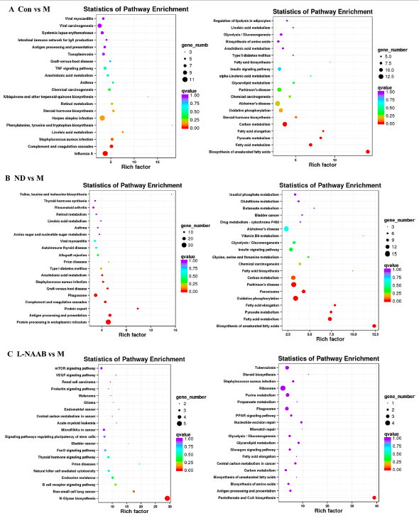 接下來(lái),進(jìn)行了KEGG通路富集分析。氣泡圖展示富集最顯著(zhù)的前20條通路(圖5A?F)。與M組相比,Con組上調的DEGs主要富集于以下通路:苯丙氨酸、酪氨酸和色氨酸的生物合成,亞油酸代謝,金黃色葡萄球菌感染,補體和凝血級聯(lián)反應,以及甲型流感病毒。ND組與M組相比,上調的DEGs主要富集在花生四烯酸代謝、金黃色葡萄球菌感染、移植物抗宿主病、吞噬小體等通路中,而ND組與M組相比上調的DEGs主要富集在以下通路:苯丙氨酸、酪氨酸和色氨酸的生物合成、亞油酸代謝、金黃色葡萄球菌感染、移植物抗宿主病、吞噬小體。在CON/M和ND/M比較中,下調的DEGs在相似的KEGG通路中富集:不飽和脂肪酸的生物合成、脂肪酸代謝、丙酮酸代謝、脂肪酸伸長(cháng)、氧化磷酸化和碳代謝。