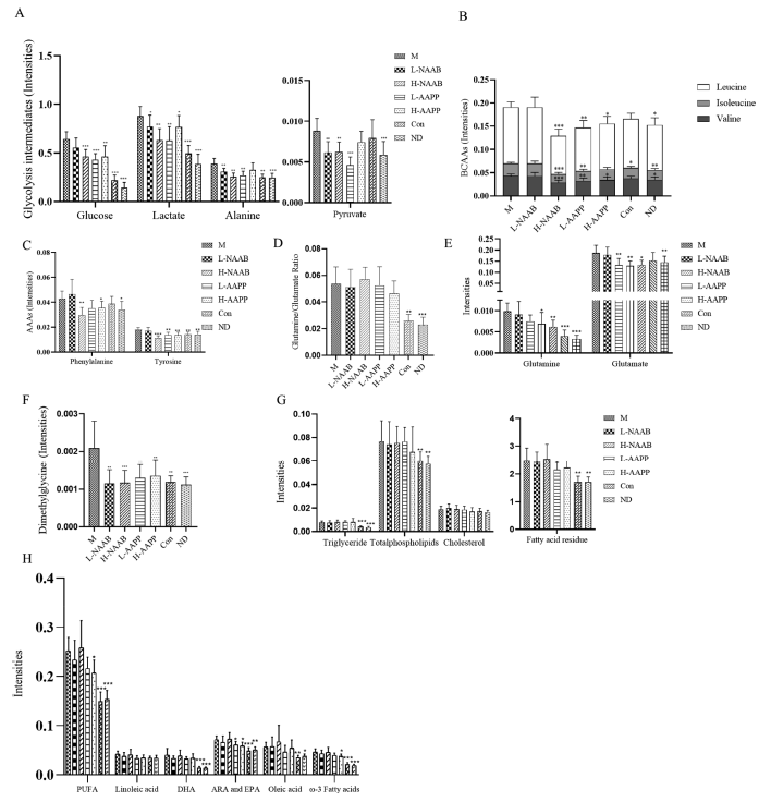 然而,ZDF大鼠中谷氨酰胺/谷氨酸比值對花青苷提取物無(wú)反應(圖6D),但L-AAPP和H-AAPP降低谷氨酰胺和谷氨酸,H-NAAB降低谷氨酸(圖6E)。與M相比,所有花青苷處理組的二甲基甘氨酸升高的水平都被逆轉到正常狀態(tài)(圖6F)。與M組相比,編碼甜菜堿-同型半胱氨酸S-甲基轉移酶的BHMT均降低。在脂質(zhì)代謝產(chǎn)物方面,L-AAPP組和H-AAPP組的肝脂譜略有改善,表現為脂肪酸殘留量、包括ω-3脂肪酸在內的不飽和脂肪酸和Ara+EPA的下降趨勢(圖6G?H)。M組顯示出總體脂質(zhì)譜增加,如高水平的磷脂、甘油三酯、脂肪酸和不飽和脂肪酸,所有這些都有助于脂肪肝的發(fā)展。L-AAPP和H-AAPP組通過(guò)調節脂肪酸殘基和不飽和脂肪酸略有改善肝脂代謝。