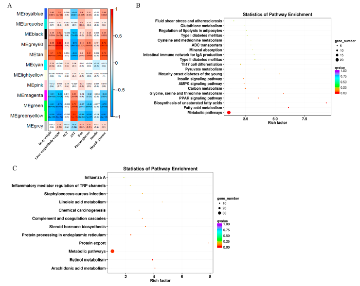使用DEGs進(jìn)行WGCNA分析以確定共表達模塊及其與臨床特征的相關(guān)性。確定了12個(gè)共表達模塊,并與以前報道的各種臨床特征(體重、AST、ALT、血尿素氮、血糖和胰島素)相關(guān)(圖7A)。MEgery 60和MEtan模塊與體重、肝重/體重比、血糖、肝糖呈正相關(guān),與天冬氨酸轉氨酶呈負相關(guān)。MEgreen和MEgreenyellow模塊與體重、肝重/體重比、血糖、肝糖呈負相關(guān),與AST值呈正相關(guān)。
