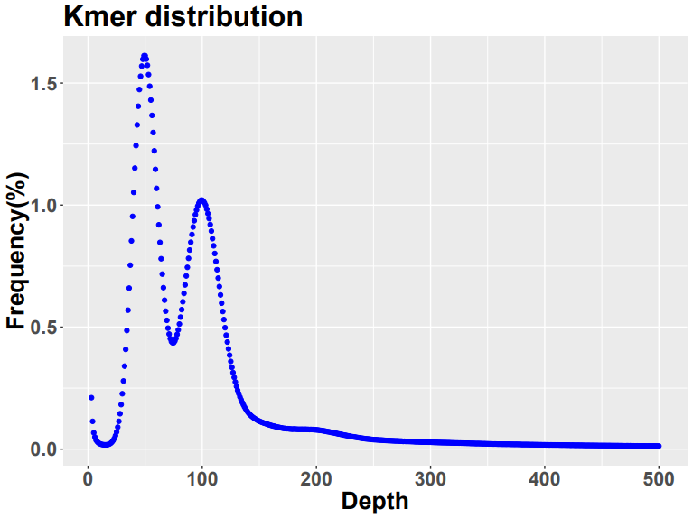 Figure 1,一個(gè)二倍體的kmer頻率-深度分布圖,橫軸為深度,縱軸為kmer出現的頻率,主峰位于深度100左右,雜合峰位于深度50左右