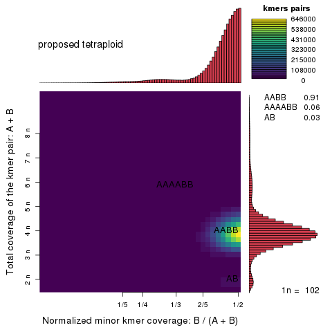 Smudgeplot通過(guò)尋找雜合k-mer來(lái)研究基因組的倍性,其定義的雜合k-mer對指的是一對k-mer之間只相差一個(gè)堿基,且沒(méi)有第三個(gè)k-mer與他們再相差一個(gè)堿基(如ATGATCA, ATGCTCA, ATGGTCA)。對于一個(gè)AB形式的雜合,smudgeplot試圖從所有k-mer中尋找一對雜合k-mer,而對于一個(gè)AAB形式的雜合,smudgeplot試圖尋找兩條相同的k-mer和一條它們的雜合k-mer,在圖中表示為更高的亮度。如下圖對一個(gè)四倍體的smudgeplot分析,可以明顯的看出AABB雜合模式附近的k-mer數量明顯高于其它k-mer,左上角也描述了這個(gè)結果。