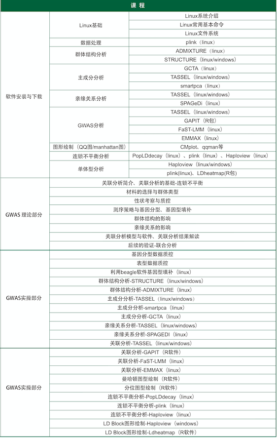 本課程主要從實(shí)踐入手,重點(diǎn)講解 GWAS 分析中用到的各種分析方法與常用分析軟件。包括群體結構分析、主成分分析、親緣關(guān)系分析、連鎖不平衡分析、單體型分析等內容。從原始數據開(kāi)始,逐步完成分析內容,并對分析內容進(jìn)行整理與挖掘,將數據轉化成更直觀(guān)的圖形來(lái)展示最終的分析結果。同時(shí),課下還可反復觀(guān)看課程視頻,有問(wèn)題隨時(shí)售后群中交流溝通,真正實(shí)現“線(xiàn)上學(xué)習理解,課后練習指導,課下文檔復習”。