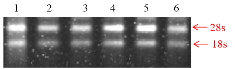 圖2:將提取的RNA每孔上樣200 ng,瓊脂糖濃度為1%,180V電壓,跑膠20 min。膠孔1:番茄果;2:南瓜葉;3:玉米根;4:南瓜莖;5:絲瓜花;6:水稻種子。