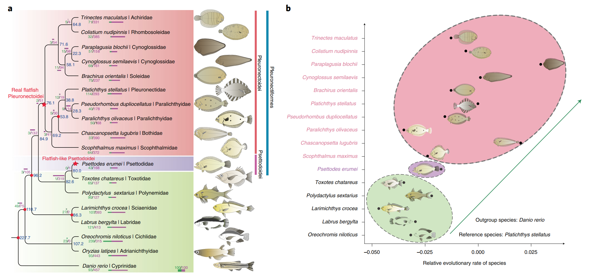 圖1 比目魚(yú)的多系起源與快速基因組進(jìn)化(Lv Z et al., Nature Genetics.2021)