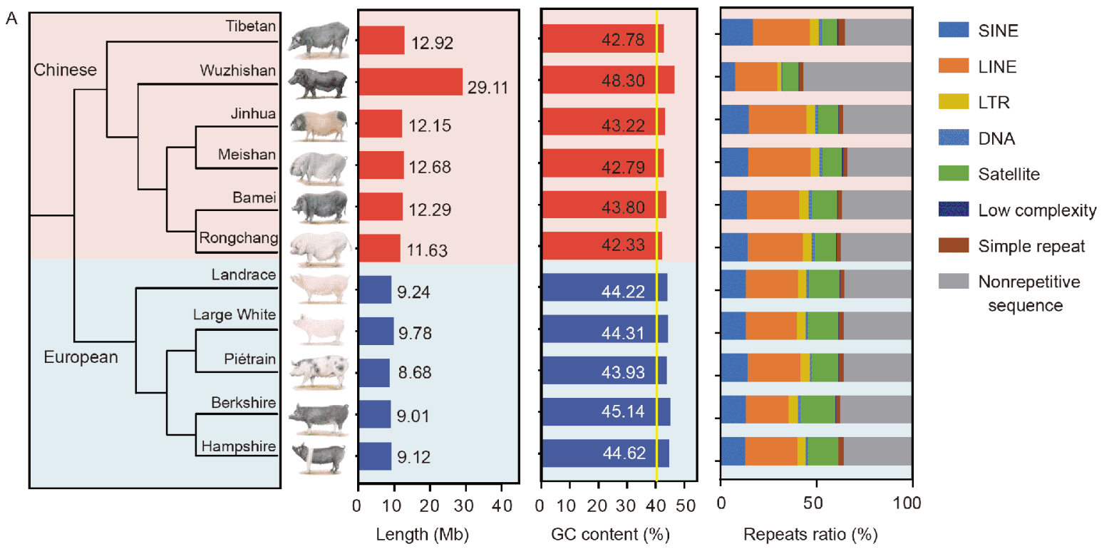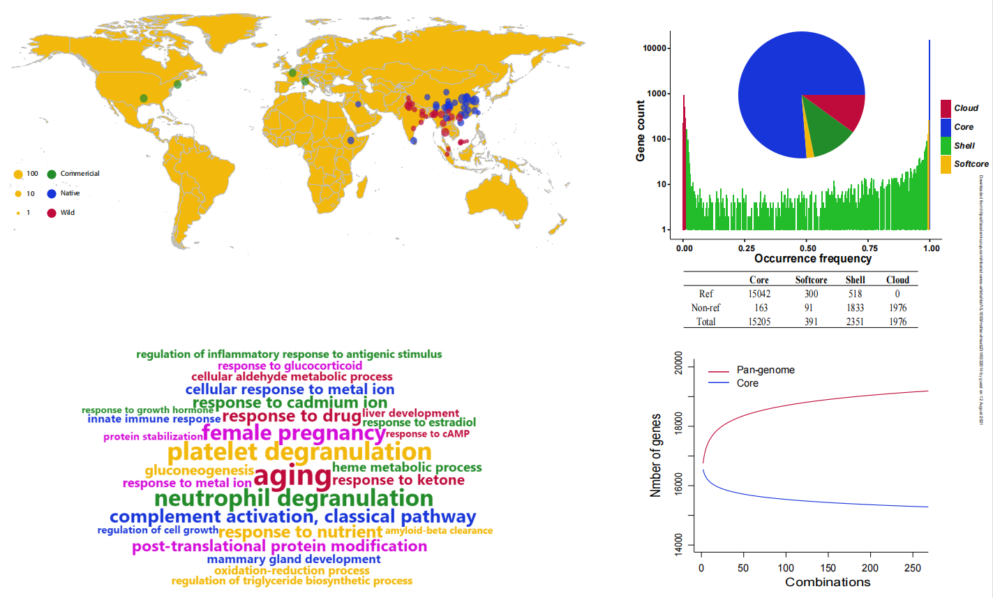 • 對于一些農業(yè)畜牧養殖相關(guān)的動(dòng)物,往往由于人工的干預或是自然環(huán)境的選擇,在同一個(gè)種內水平下會(huì )有非常多的品系/亞種/變種。這些馴化前后的群體間表型和基因型的巨大差異可能隱藏在每個(gè)品系基因組種,因此能體現這些動(dòng)物品系內的共性又能體現不同品種間差異的泛基因組就顯得尤為重要。