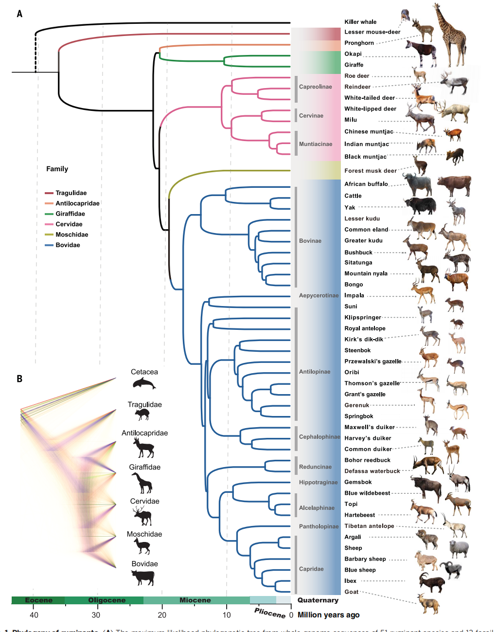 同樣這樣大規模不同科屬研究的還有2020年Nature封面文章,通過(guò)6種蝙蝠基因組揭示演化和潛在功能,探索蝙蝠有別于其他哺乳動(dòng)物的免疫調節機制。以及2020年發(fā)表在Science上的反芻動(dòng)物基因組,該研究共進(jìn)行了6個(gè)科的44個(gè)反芻動(dòng)物De novo組裝,結合化石信息,構建了所有節點(diǎn)100%支持的全基因組系統發(fā)育樹(shù),高置信度的進(jìn)化樹(shù)進(jìn)一步確認了叉角羚科與長(cháng)頸鹿科的姐妹類(lèi)群關(guān)系,以及麝科與??平忝妙?lèi)群關(guān)系等一直以來(lái)備受爭議的分類(lèi)問(wèn)題。并對反芻動(dòng)物基因組結構特征及演化進(jìn)行研究,進(jìn)而對反芻動(dòng)物中的“消化系統”“多腔胃演化”“角形態(tài)”“體型”等特征進(jìn)行解析。該研究基于大量的基因組數據,將反芻動(dòng)物基因功能與動(dòng)物的適應性性狀聯(lián)系起來(lái),為動(dòng)物譜系基因組打開(kāi)了一個(gè)新的研究篇章。