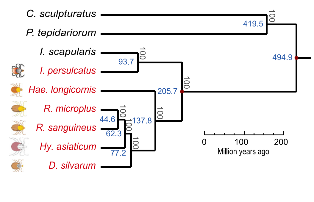 除了上述跨越科水平的譜系基因組研究,其實(shí)還有很多同科內不同屬間的動(dòng)物群體基因組。例如通過(guò)構建硬蜱科內6種蜱蟲(chóng)基因組,解析不同蜱種的演化歷程,揭示了蜱專(zhuān)性吸血的遺傳機制以及蜱蟲(chóng)遺傳多樣性及分布規律,并通過(guò)宏基因組學(xué)研究等方式探究了蜱媒病原體的生態(tài)分布和進(jìn)化機制(Jia N et al., Cell.2020)。