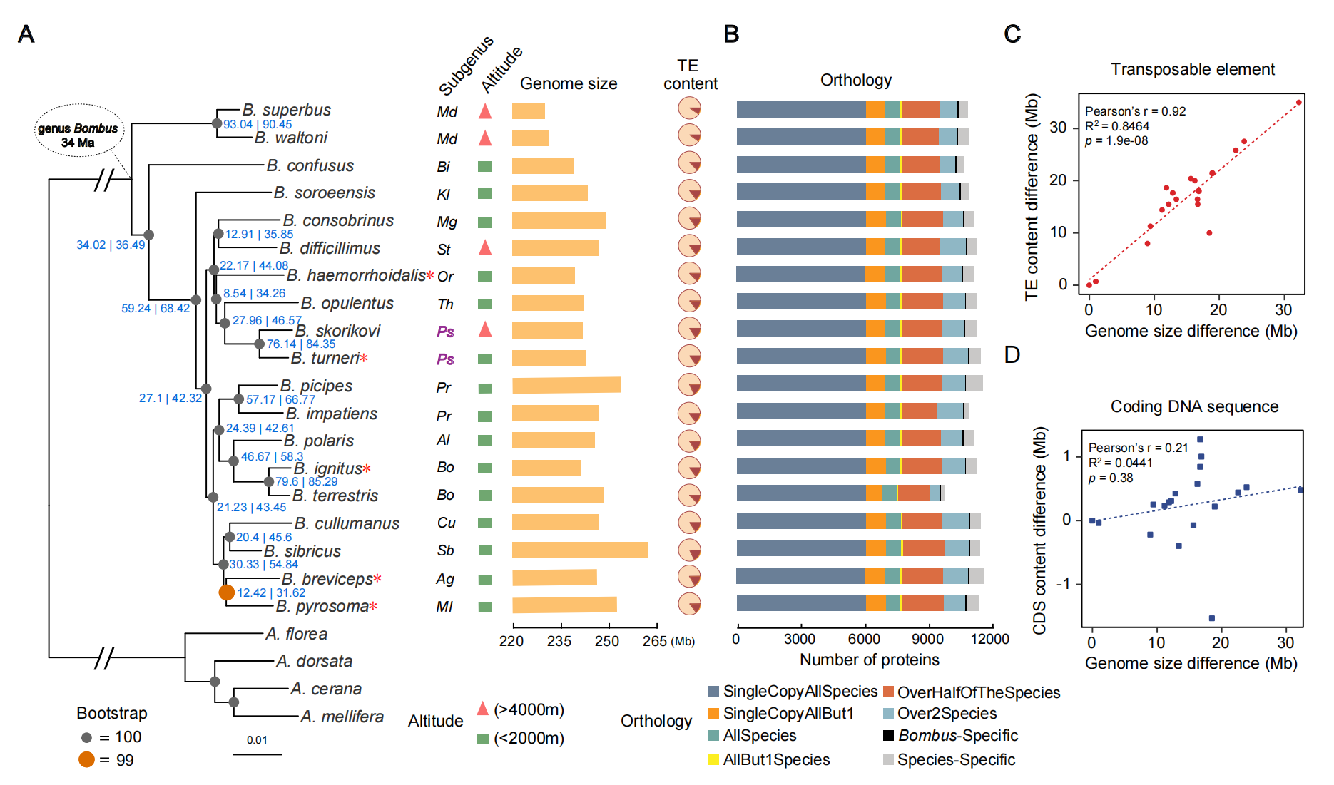 圖4 蝴蝶進(jìn)化關(guān)系(上)與熊蜂進(jìn)化關(guān)系及基因組結構特征(下)