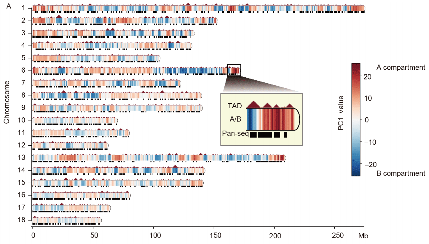圖6 豬基因組特征及泛基因組A/B Compartment、TAD分布