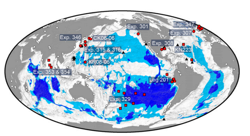 圖1 采樣地點(diǎn)的位置。紅色圓圈分別表示海洋邊緣站點(diǎn),紅色方塊分別表示開(kāi)放海洋站點(diǎn)。淺藍色和深藍色區域分別顯示整個(gè)沉積物中可能發(fā)生溶解氧和有氧活動(dòng)的最大和最小區域。在14次科學(xué)考察中,從40個(gè)地點(diǎn)采集了海底以下許多不同深度的299個(gè)沉積物樣本,用于比較不同全球海底沉積物微生物群落組成。