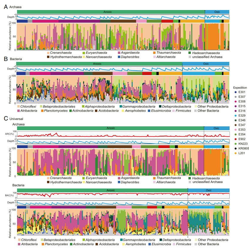 圖3 海洋沉積微生物群落的物種區系組成。(A)使用古菌特異性引物獲得的235個(gè)樣品的古菌群落組成。(B)使用細菌特異性引物獲得的272個(gè)樣品的細菌群落組成。(C)使用通用引物獲得的245個(gè)樣品的古菌群落組成和281個(gè)樣品的細菌群落組成,未顯示少于1,000條序列的樣本。淺藍色折線(xiàn)圖以對數刻度顯示沉積物深度。