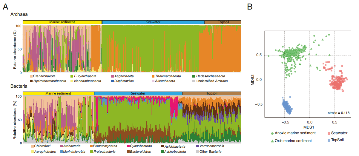 圖4 比較海洋沉積物、海水和表層土壤的微生物群落組成。(A)使用16S rRNA通用引物獲得的古菌和細菌群落組成。(B)使用從ASV中獲得的Jaccard相似性指數值生成的NMDS排序圖。