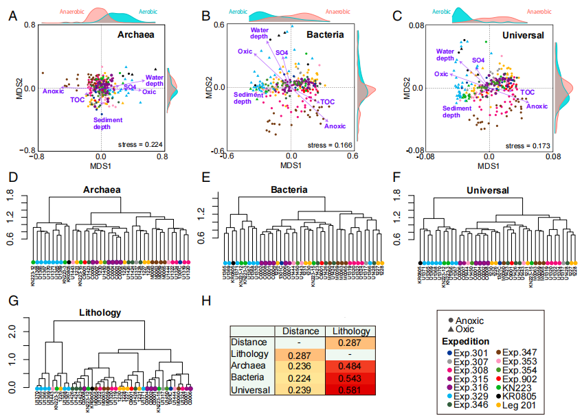 圖5 海洋沉積物微生物群落的β多樣性。(A–C)使用Jaccard相似性指數值生成的古菌(A),細菌(B)和通用引物數據集的NMDS排序圖。紫色箭頭表示與特征為P <0.01的環(huán)境因子相符的向量。(D–F)基于Jaccard相似性指數值,分別對40個(gè)地點(diǎn)的古菌(D),細菌(E)和通用引物數據集(F)進(jìn)行算術(shù)平均(UPGMA)樹(shù)狀圖的非加權成對分組法。(G)基于40處沉積物的礦物成分的UPGMA巖性樹(shù)狀圖。(H)確定地理距離或巖性是否與微生物群落組成相關(guān)。