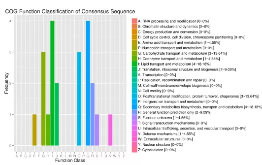 在COG富集分析中橫軸代表功能分類(lèi),縱軸代表基因頻數。