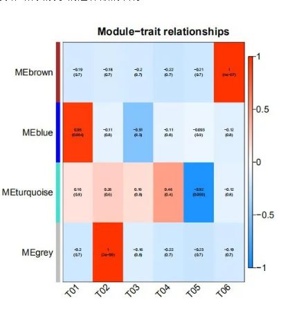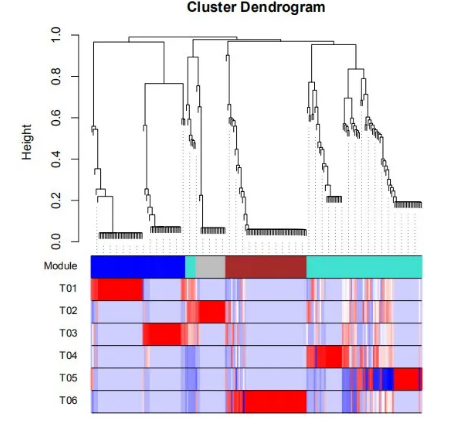 基因的系統樹(shù)圖及性狀相關(guān)性熱圖主要分為三個(gè)部分:第一個(gè)部分為基因聚類(lèi)繪制的聚類(lèi)樹(shù),分枝代表基因;第二部分為基因聚類(lèi)樹(shù)根據不同的聚類(lèi)對應到的不同模塊;第三部分為性狀的熱圖,如圖中T01~T06為性狀,對應熱圖中的顏色越深,說(shuō)明該模塊中的基因與該性狀的相關(guān)性越高。