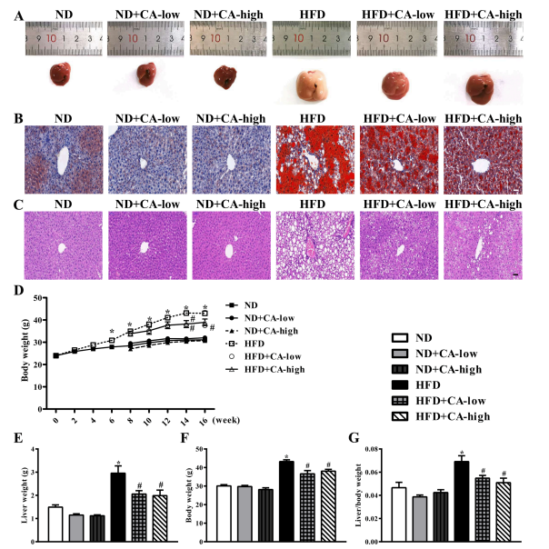 ? ? ? ?本研究旨在評估CA治療高脂喂養小鼠的潛在益處,重點(diǎn)關(guān)注在NAFLD發(fā)病機制中,除了調節內毒素相關(guān)炎癥信號機制和脂代謝改變外,恢復腸道菌群平衡可能與之有關(guān)。為了研究CA對脂質(zhì)積累的影響,我們分別用低濃度和高濃度的CA喂養小鼠。肝脂肪變性是主要的組織病理學(xué)表現;在其他研究中觀(guān)察到,高脂飼料喂養小鼠的肝臟比三組ND小鼠的肝臟出現更多的脂肪變性,宏觀(guān)上黃色和堅硬的紋理證明了這一點(diǎn)(圖1A)。值得注意的是,添加0.08%或0.16% CA的HFD小鼠肝臟表面呈紅褐色,質(zhì)地柔軟。肝切片HE染色(圖1B)和油紅O染色(圖1C)證實(shí)了這一點(diǎn)。與ND組相比,高脂飼料喂養的小鼠脂肪滴更多、更大,而CA處理的小鼠脂肪滴更少。與ND組相比,HFD干預8周后小鼠體重顯著(zhù)增加,并持續增加至16周。然而,從第8周開(kāi)始,飼糧中添加0.08%或0.16%的CA可以有效地緩解hfd誘導的體重增加,特別是在第14周(CA濃度均為)和第16周(僅添加0.08% CA)時(shí)(圖1D)。在肝臟重量(圖1E)、體重(圖1F)和肝臟/體重(圖1G)以及兩種濃度的CA處理中也可以觀(guān)察到類(lèi)似的結果,這降低了hfd誘導的肝臟重量、體重和肝臟/體重的增加。與只喂食ND組相比,添加CA的ND組對這些指標沒(méi)有任何差異。