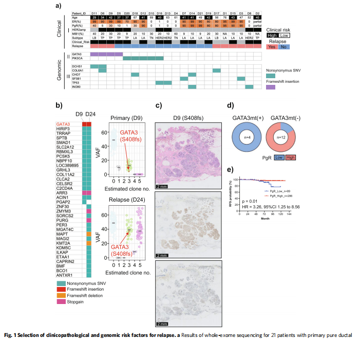 GATA3和PIK3CA突變是隊列中最常見(jiàn)的突變,分別出現在4例(19%)和5例(24%)患者中。在4例GATA3突變患者中,3例出現IDC復發(fā)。GATA3突變陽(yáng)性與GATA3突變陰性復發(fā)的優(yōu)勢比(OR)為5.5(95%CI=0.63–76.7)。為了進(jìn)一步研究GATA3突變在復發(fā)中的意義,對復發(fā)腫瘤患者的樣本進(jìn)行額外分析,以確定與配對原發(fā)性DCI相比的突變狀態(tài)。