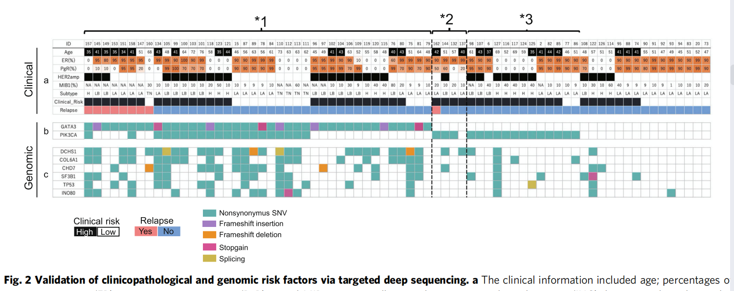 為了確定所識別的高危標記物的分子病因,調查了另外三名具有代表性的新鮮冰凍標本患者?;颊逜患有帶有GATA3突變(圖2,*1)和微侵襲的DCIS,病變被認為是真正的DCIS?;颊連患有PgR低表達的DCIS(圖2,*2)和微侵襲,病變被視為真正的DCIS?;颊逤患有PIK3CA突變的DCIS(圖2,*3),沒(méi)有任何微侵襲,病變被認為可能是假DCIS(低風(fēng)險DCIS)。