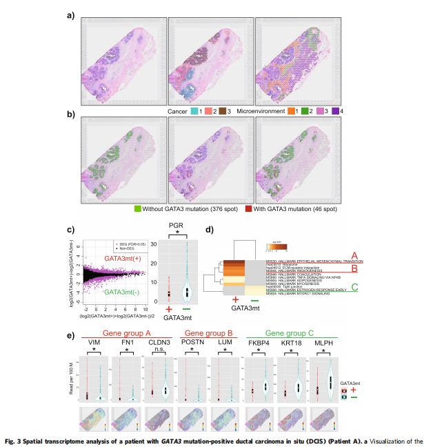 首先,利用空間轉錄組學(xué)技術(shù)——10X基因組學(xué)Visium平臺,通過(guò)STseq分析了患者A標本的空間基因表達。該患者在術(shù)前病理診斷中被診斷為DCIS,但在術(shù)后病理診斷中發(fā)現有微侵襲部位。因此,DCIS病變被確定為IDC的真正前兆。平均深度為×2391.4的面板測序分析顯示該樣本含有GATA3突變(外顯子4:c.865dupG:p。C288fs,變異等位基因頻率[VAF]=7%)。在較高的VAF(外顯子5:c.T1035A:p。N345K,VAF=26.1%),表明新出現的GATA3突變用PIK3CA突變覆蓋了DCIS的基本特征。