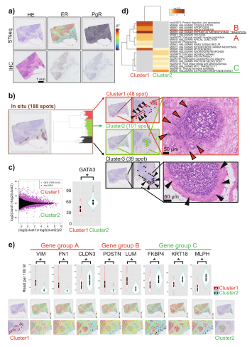Visium分析發(fā)現了異質(zhì)基因表達,這取決于癌區和非癌區細胞的位置。PgR表達下調,盡管觀(guān)察到高ER表達(圖4a,上圖),與免疫染色結果一致(圖4a,下圖)。針對DCIS細胞中基因表達的變化,手動(dòng)選擇了188個(gè)位于導管內區域的形態(tài)學(xué)斑點(diǎn)。這些斑點(diǎn)的無(wú)監督分層聚類(lèi)確定了三個(gè)明顯的聚類(lèi)(圖4b,左面板)。在空間上,不同的簇對應于不同的區域(圖4b,中間面板)。重要的是,簇1的48個(gè)斑點(diǎn)(紅色)與DCIS細胞的位置重疊,DCIS細胞根據其形態(tài)即將入侵(由圖4b右面板中的紅色箭頭指示)。同時(shí),簇2(有色綠色)的101個(gè)斑點(diǎn)位于同一導管的中心,并被視為不侵入基質(zhì)的細胞(由圖4B的中間板中的綠色斑點(diǎn)指示)。簇1和簇2之間的差異表達分析確定了2747個(gè)DEG(FDR<0.05,圖4c,左)。有趣的是,GATA3表達在簇1中顯著(zhù)下調(圖4c,右圖)。盡管該基因未發(fā)生突變,但該患者的GATA3功能異??赡馨l(fā)生在基因水平。根據基因富集和通路分析的結果,該患者始終觀(guān)察到以GATA3為中心的基因表達變化,如患者A所觀(guān)察到的(圖4d,e)。共有21條途徑和18個(gè)癌癥特征,包括EMT和血管生成途徑受到影響。如對患者A所觀(guān)察到的,在未侵入間質(zhì)的第2組中,DEG主要代表雌激素反應相關(guān)基因??傊?,在這名患者身上,我們得出結論,GATA3通過(guò)其表達的變化發(fā)揮關(guān)鍵作用。即使沒(méi)有基因組突變,GATA3的異常表達也可能在某些患者中導致相同的結果。
