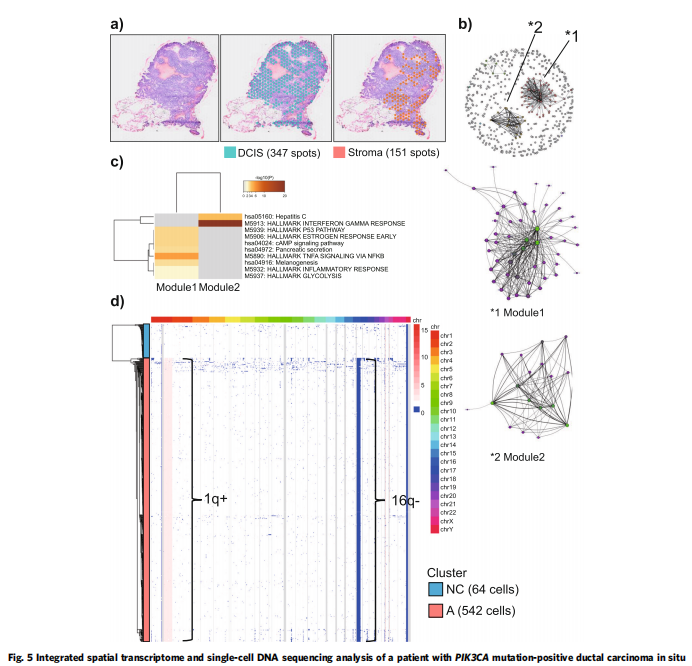 通過(guò)全外顯子組測序,平均深度為×134.8。Visium分析揭示了一種單調的基因表達模式,與該癌的形態(tài)學(xué)單克隆結構一致(圖5a,左面板)。事實(shí)上,這些斑點(diǎn)通過(guò)非層次聚類(lèi)大致分為兩個(gè)簇(圖5a,中間和右側面板)。它們幾乎與形態(tài)學(xué)確定的癌細胞和非癌細胞(基質(zhì)細胞)完全重疊。因此,使用DEG分析比較了癌細胞中的347個(gè)斑點(diǎn)(藍色斑點(diǎn))和基質(zhì)細胞中的151個(gè)斑點(diǎn)(橙色斑點(diǎn)),并確定了癌斑點(diǎn)中508個(gè)上調的DEG(FDR<0.05)。加權基因共表達網(wǎng)絡(luò )分析(WGCNA)顯示,與非癌點(diǎn)相比,癌點(diǎn)中只有兩個(gè)主要節點(diǎn)(模塊)發(fā)生改變(圖5b,上面板)。進(jìn)行了子網(wǎng)絡(luò )分析,以確定樞紐基因(圖5b,中間和下部面板)。hub基因的途徑富集分析顯示,參與雌激素反應和p53途徑的基因在模塊1中富集(圖5c,補充數據5),這與在患者A和B中觀(guān)察到的良性出現斑點(diǎn)的特征相同,表明該病變中沒(méi)有發(fā)生惡性轉化。