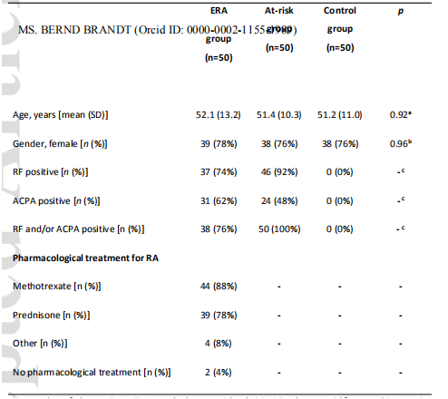 從2017年11月到2019年7月共納入了150名參與者,每組50人(表1)。ERA患者平均在確診為RNA后3.1±1.7個(gè)月入選。大部分ERA患者按照國家類(lèi)風(fēng)濕關(guān)節炎藥物治療指南采用甲氨蝶呤治療,多與強的松聯(lián)合治療(表1)。