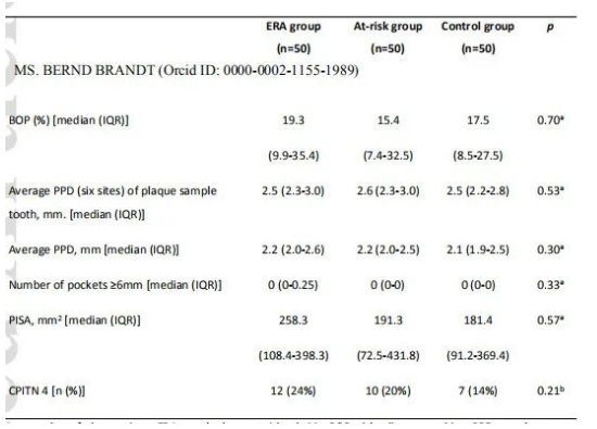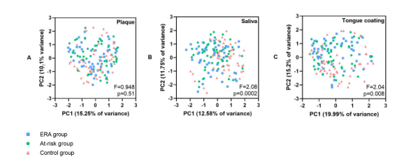 方法:招募三組(每組50人):ERA患者、高危個(gè)體和健康對照。牙周檢測結果為探診出血評分(BOP)、袋探診深度評分(PPD)和牙周炎癥表面積評分(PISA)。采用16S rDNA擴增子測序評估齦下牙菌斑、唾液和舌苔的微生物組成,并采用PERMANOVA進(jìn)行組間差異分析。