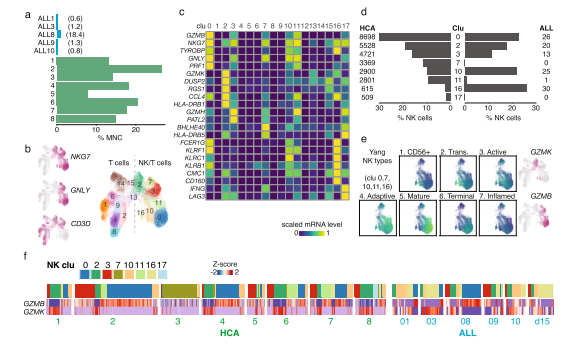 為了進(jìn)一步表征免疫細胞群,將HCA和E/R+ ALL供體的T細胞和NK細胞匯集在一起進(jìn)行聯(lián)合分析?;诰垲?lèi)和marker基因分析,可以區分幾種不同的NK細胞類(lèi)型(圖 4b、c)。篩選表達GNLY或NKG7的cluster(cluster 0、2、3、7、10、11、16),發(fā)現與來(lái)自HCA供體的NK細胞相比,來(lái)自ALL BM的NK細胞被隨機分配給這些cluster(圖 4d)。具體來(lái)說(shuō),所有NK細胞主要代表cluster 10和16,它們與表達未成熟CD56bright 和過(guò)渡NK細胞的顆粒酶 K(GZMK)相匹配(圖 4e 中的基因組評分代表來(lái)自scRNA-seq研究的NK亞型)。相比之下,大多數正常 BM NK細胞代表表達顆粒酶 B(GZMB)和穿孔素(PRF1)的成熟或終末NK細胞(cluster 0)。因此,E/R+白血病細胞可能會(huì )主動(dòng)逃避NK細胞的細胞毒性,然而,NK類(lèi)型的頻率因供體而異(圖 4f)。高表達IFNG的cluster 7幾乎完全對應于HCA供體 3,而與其他ALL病例相比,細胞周期高度活躍的ALL8和ALL9更類(lèi)似于正常BM中的成熟或活性NK細胞譜??傊?,白血病細胞狀態(tài)與正常pro-B分化狀態(tài)的不同之處在于干/祖細胞特異性基因和幾種免疫調節基因的高表達。免疫調節基因的變化反映為E/R+ BM內更多不成熟的NK細胞類(lèi)型。