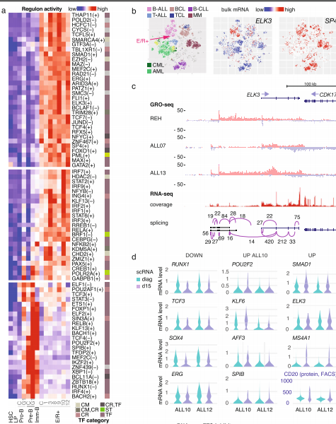 基于bulk RNA分析可以驗證它們在B-ALL中的表達,在E/R+亞型(紅色箭頭)中檢測到的比例*高,如在t-SNE圖上比較血液系統惡性腫瘤所示(圖 5b),其中惡性淋巴瘤在圖上突出顯示。兩種常見(jiàn)的B-ALL亞型(E/R+和高超二倍體病例)顯示出類(lèi)似的高ELK3,而升高的SP4則更具 E/R 特異性,進(jìn)一步分析了E/R+細胞中的這些TF基因座(圖 5c)。本研究使用GRO-seq對E/R+ BM中的新生轉錄進(jìn)行了分析,揭示了Pol2參與編碼和非編碼區的主動(dòng)起始和延伸。GRO-seq 證實(shí)了這些基因位點(diǎn)在 E/R+細胞中的轉錄活性(圖 5c)。此外,還揭示了ELK3上游未注釋?zhuān)≧efseq、UCSC 或 Gencode)的轉錄起始位點(diǎn)(TSS)(圖 5c)。兩個(gè)lncRNA庫在該基因組區域內具有匹配的轉錄本,但注釋之間的一致性很差。因此,在E/R+ BM(n = 8,scRNA-seq 和 GRO-seq 分析中的匹配樣本)中使用配對的bulk RNA-seq 進(jìn)一步檢測了該基因座內的剪接模式。帶注釋的ELK3轉錄本具有來(lái)自剪接點(diǎn)跨越reads的支持,而上游轉錄本與lncRNA結構*匹配(圖 5c)。