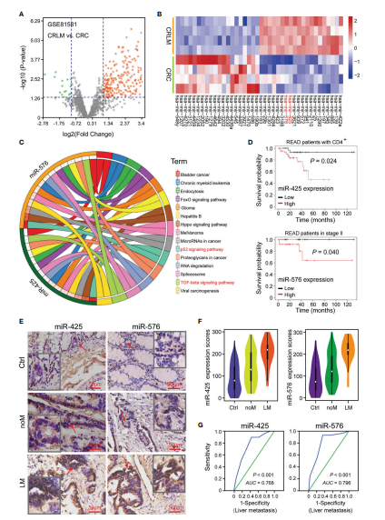 為了驗證這兩種miRNA的差異表達,作者收集了157例CRC患者癌組織及癌旁組織。TMA和ISH試驗顯示,與對照相比miR-425和miR-576在CRC患者中高表達尤其是肝轉移患者(圖1E和F)。ROC曲線(xiàn)計算miR-425和miR-576基于肝轉移及其他相關(guān)危險因素線(xiàn)下面積,初步確定其在CRLM中的可信診斷能力(圖1G)。