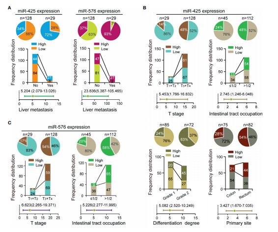為了探討miR-425和miR-576在CRLM患者中的臨床價(jià)值,作者分析了miR-425和miR-576與環(huán)境因素或病理變量包括年齡、性別、家族史、T分期、樣本量、腸道占位、分化、血管浸潤、原發(fā)部位和肝轉移。頻率分布和校正后的回歸分析顯示,miR-425和miR-576高表達均在肝轉移患者組織中頻繁分布(圖2A)。此外,miR-425過(guò)表達與CRC患者晚期T期、腸道占位、分化程度和原發(fā)性直腸相關(guān)(圖2B)。增加miRNA的表達是滲透到漿膜和廣泛占用腸道的一個(gè)促進(jìn)因素(圖2C)。
