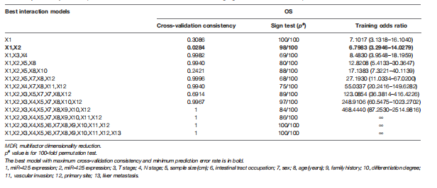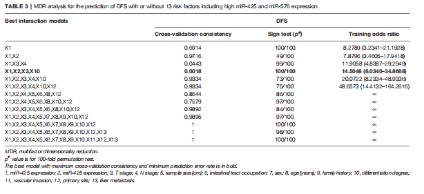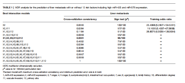 MDR分析顯示,miR-425、miR-576與家族病史、分化程度、原發(fā)部位聯(lián)合使用是評估肝轉移風(fēng)險的最佳預測模型,其交叉驗證一致性(CVC)最高,預測誤差最?。ū?)。這些結果提示miR-425和miR-576高水平的CRC患者特別容易發(fā)生肝轉移。