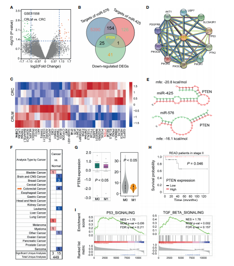 為了闡明miR-425和miR-576介導肝轉移和不良預后的有意義的下游靶點(diǎn),作者在GSE81558 (n = 6)數據集上繪制火山圖,分析CRC組織和癌旁組織之間的DEGs(圖4A)。PTEN是CRLM中顯著(zhù)下調基因與miR-425和miR-576靶基因的交集(圖4B)。聚類(lèi)熱圖顯示在CRLM中PTEN的下調最顯著(zhù)(圖4C)。進(jìn)一步檢索STRING發(fā)現與PTEN互作的關(guān)鍵蛋白(圖4D)。配對序列間的有效MFEs分別為?20.8和?16.1 kcal/mol(圖4E)。進(jìn)一步分析發(fā)現,基于TCGA數據庫PTEN在幾種類(lèi)型的腫瘤中表達顯著(zhù)下調(圖4F),PTEN表達越低易發(fā)生腫瘤轉移且預后越差(圖4G和H)。此外,基于GSE62321 (n = 26)數據集,PTEN與miR-425和miR-576一致,證實(shí)PTEN正向參與P53、TGF-β信號通路,在腫瘤轉移中發(fā)揮有意義的作用(圖4I)。這些結果表明,PTEN下調是CRLM中miR-425和miR-576的共同靶點(diǎn),導致臨床結果不佳。
