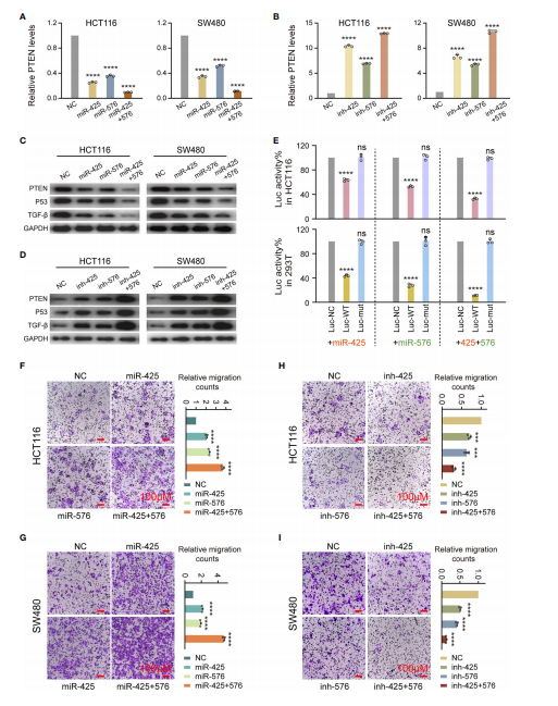 接下來(lái),作者證明了miR-425和miR-576通過(guò)負調控PTEN-P53/TGF-β軸,在細胞學(xué)水平上通過(guò)敲低和過(guò)表達功能實(shí)驗確定了其誘導CRC轉移的發(fā)生。QPCR檢測發(fā)現,在HCT116和SW480細胞系中,這兩種miRNA的過(guò)表達均導致PTEN mRNA表達明顯抑制(圖5A)。MiR-425和miR-576的缺失顯著(zhù)增強了PTEN mRNA的表達(圖5B)。WB試驗證實(shí)PTEN蛋白的變化一致,P53和TGF-β也是如此(圖5C和D)。正如預期的那樣,結果顯示miR-425和miR-576顯著(zhù)抑制WT熒光素酶基因表達強度,然而在Mut基因上沒(méi)有觀(guān)察到明顯的變化表明PTEN 3’UTR與miR-425和miR-576之間存在直接的結合模式(圖5E)。此外miR-425和miR-576的高表達顯著(zhù)促進(jìn)了HCT116和SW480細胞的遷移能力分,反之亦然(圖5F-I)。綜上所述,miR-425和miR-576直接靶向PTEN介導的P53/TGF-β信號通路,參與了CRLM過(guò)程中細胞遷移的促進(jìn)。