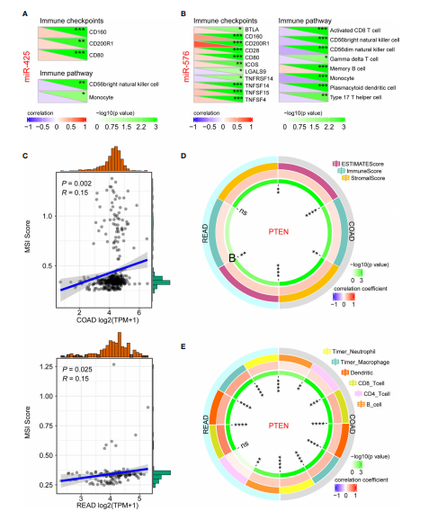 為了進(jìn)一步研究miR-425和miR-576在CRLM發(fā)生和發(fā)育的免疫調節中的重要作用,作者首先分析了miR-425和miR-576與相關(guān)指標的相關(guān)性。因此,miR-425在CRC進(jìn)展中與免疫檢測點(diǎn)密切相關(guān),如CD160、CD200R1和CD80及免疫通路包括CD65自然殺傷細胞和單核細胞(圖6A)。MiR-425與檢測點(diǎn)和通路存在顯著(zhù)相關(guān)性(圖6B)。此外,作者進(jìn)一步發(fā)現腫瘤抑制因子PTEN與MSI、TME、免疫細胞浸潤呈正相關(guān),從免疫的角度闡明了PTEN對CRLM的調控作用(圖6C-E)。以上結果表明,miR-425/ miR-576介導的PTEN抑制通過(guò)觸發(fā)免疫逃逸促進(jìn)CRLM過(guò)程。